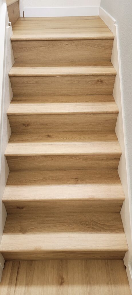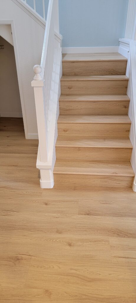 We also removed the carpet on the stairs, hallway, and two bedrooms upstairs. Once the installation was complete, the difference was remarkable. The lighter wood tones reflected natural light beautifully, making the entire condo feel more open and airy.