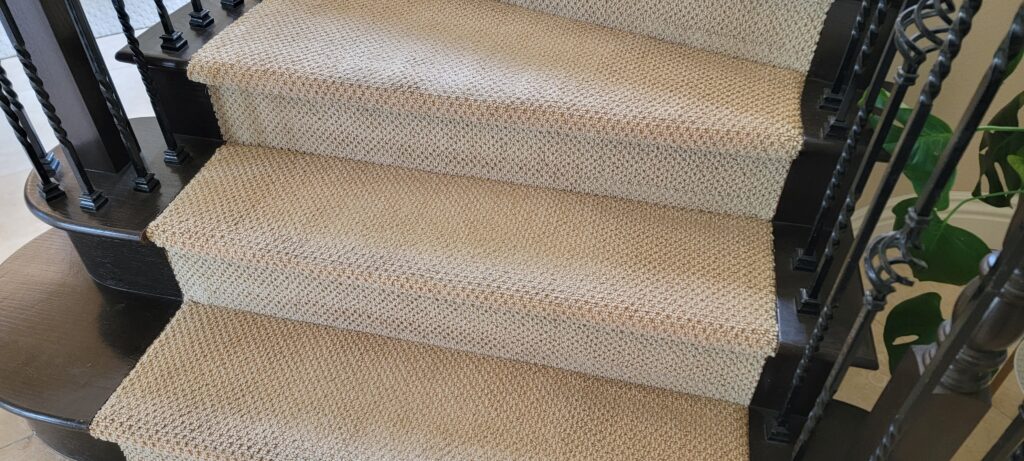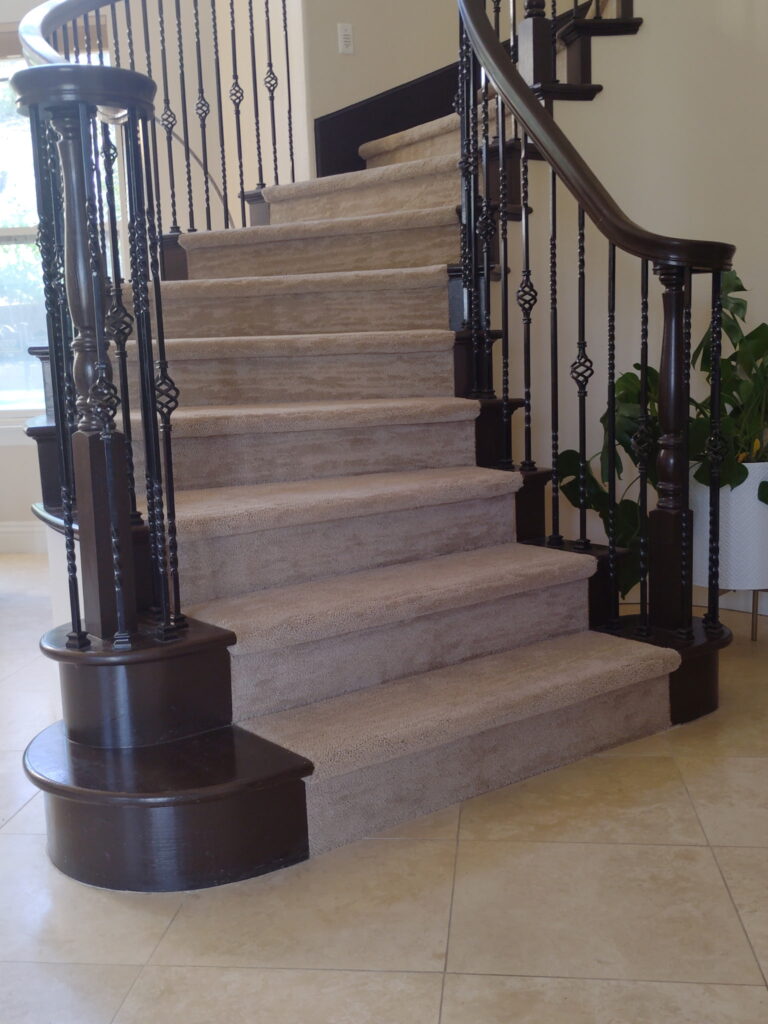 Craig, one of our expert installers, spent hours shimming and fine-tuning the subfloor beneath the new carpet. His careful attention to detail ensured a clean, seamless transition that matched beautifully with the false tread hardwood trim.