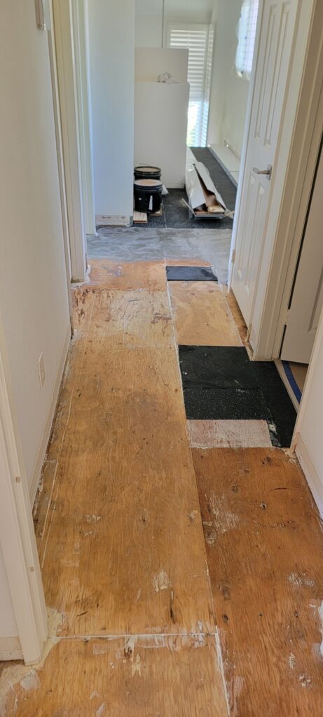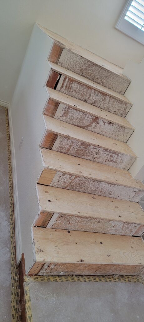 Upstairs presented a different challenge. Multiple remodels over the years had left the subfloor uneven, requiring extensive prep work. We spent extra time repairing and leveling the surfaces to create a strong, stable foundation before installing the hardwood. The extra effort was worth it—the new floors look flawless and feel solid underfoot.