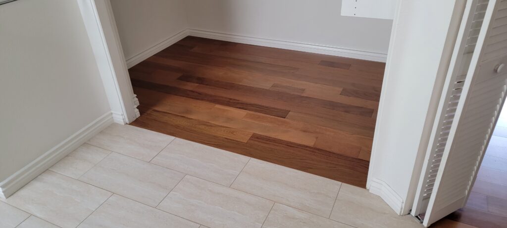 After reviewing several carefully selected samples, the homeowners fell in love with a gorgeous Brazilian Teak hardwood from Indus Parquet. The tone and grain blended nearly perfectly with the existing floors. The finished result is a seamless transition from downstairs to upstairs—so natural, you’d never know the floors were installed years apart.