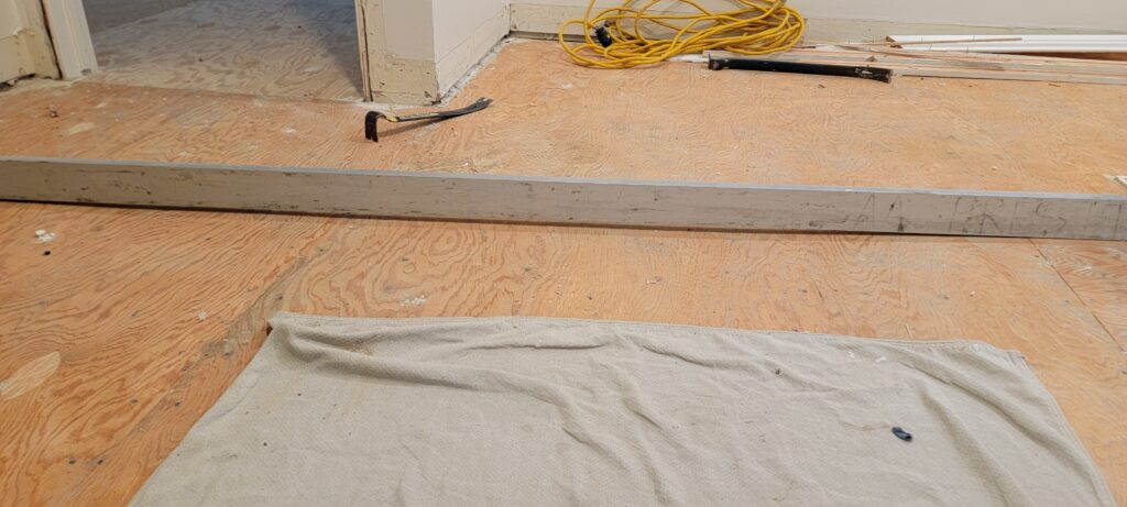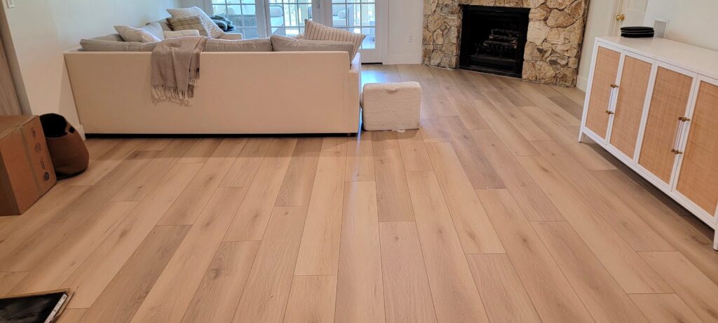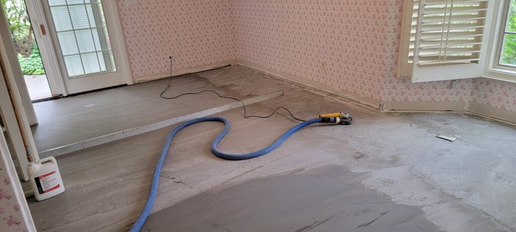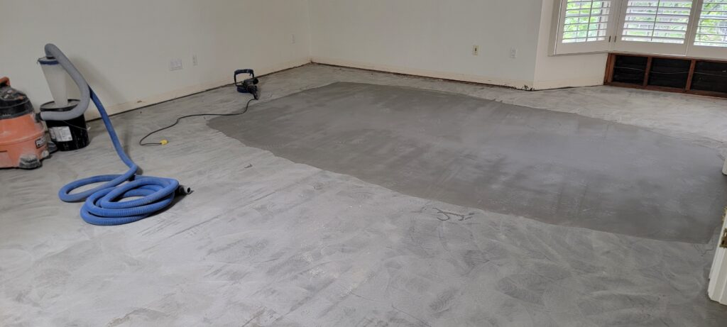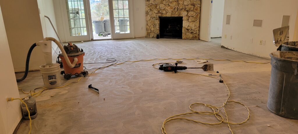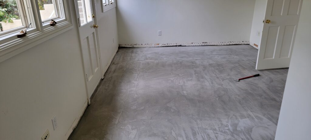 However, working on older homes often comes with its own set of challenges. This particular property, built on a terrace, had extremely uneven concrete subfloors. Before any flooring could be installed, we spent over a week carefully pouring self-leveling compound and grinding high spots to create a stable, level foundation. It’s work that often goes unseen, but it’s absolutely critical — because sadly, we get calls every week from homeowners asking us to fix buckling or shifting vinyl plank floors that were installed over poorly prepared subfloors. The only true fix in those cases? Removing everything and starting fresh — a costly and frustrating experience that professional prep work can prevent.