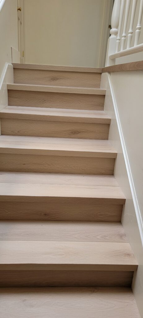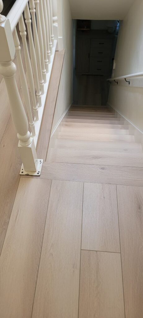 One final detail: when the stair moldings arrived, we noticed they didn’t quite match the flooring’s tone. Rather than settling, we custom-fabricated new stair nosings from the actual flooring material itself. Not only did this create a seamless look, but the eased edge design also provided a stronger, safer finish — especially important for families with young kids. Stair trim failure is more common than many realize, and we often recommend this custom solution for clients who want both safety and style.
