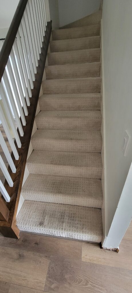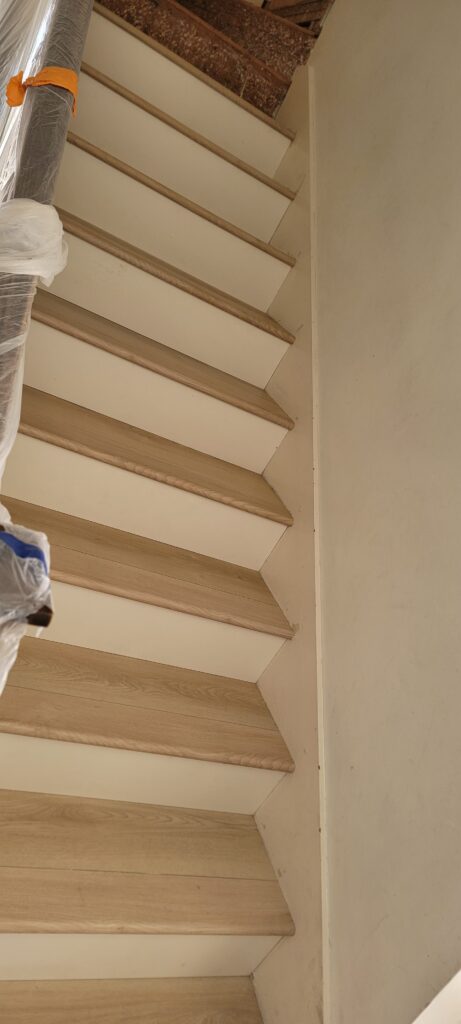 She loved it so much that asked if we could also remove the old worn carpet on her stairs and upper hall and replace them with this great vinyl plank flooring in her home in Tierrasanta. We also recommended City View painting to come back in to fill and retexture around the new flooring.